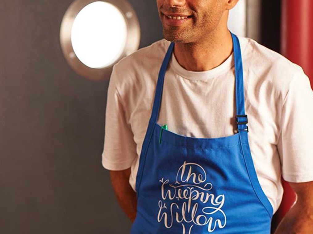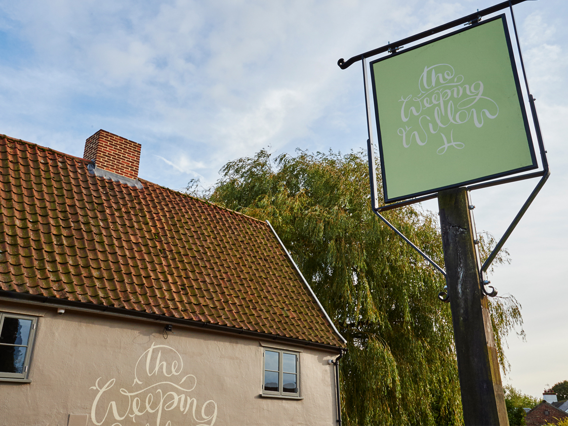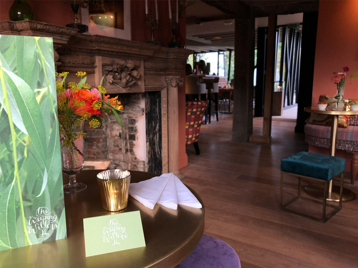 It was therefore essential to create a brand which set The Weeping Willow apart from others; a brand that has direction and aspiration, a place where not only locals come to drink and unwind, but also a destination kitchen serving dishes with Le Cordon Bleu elegance. The logo uses hand lettering to simulate the organic shapes and natural movement of a willow tree and its leaves, which in turn creates a soft and friendly brand character. This is followed through in the interior of the pub.